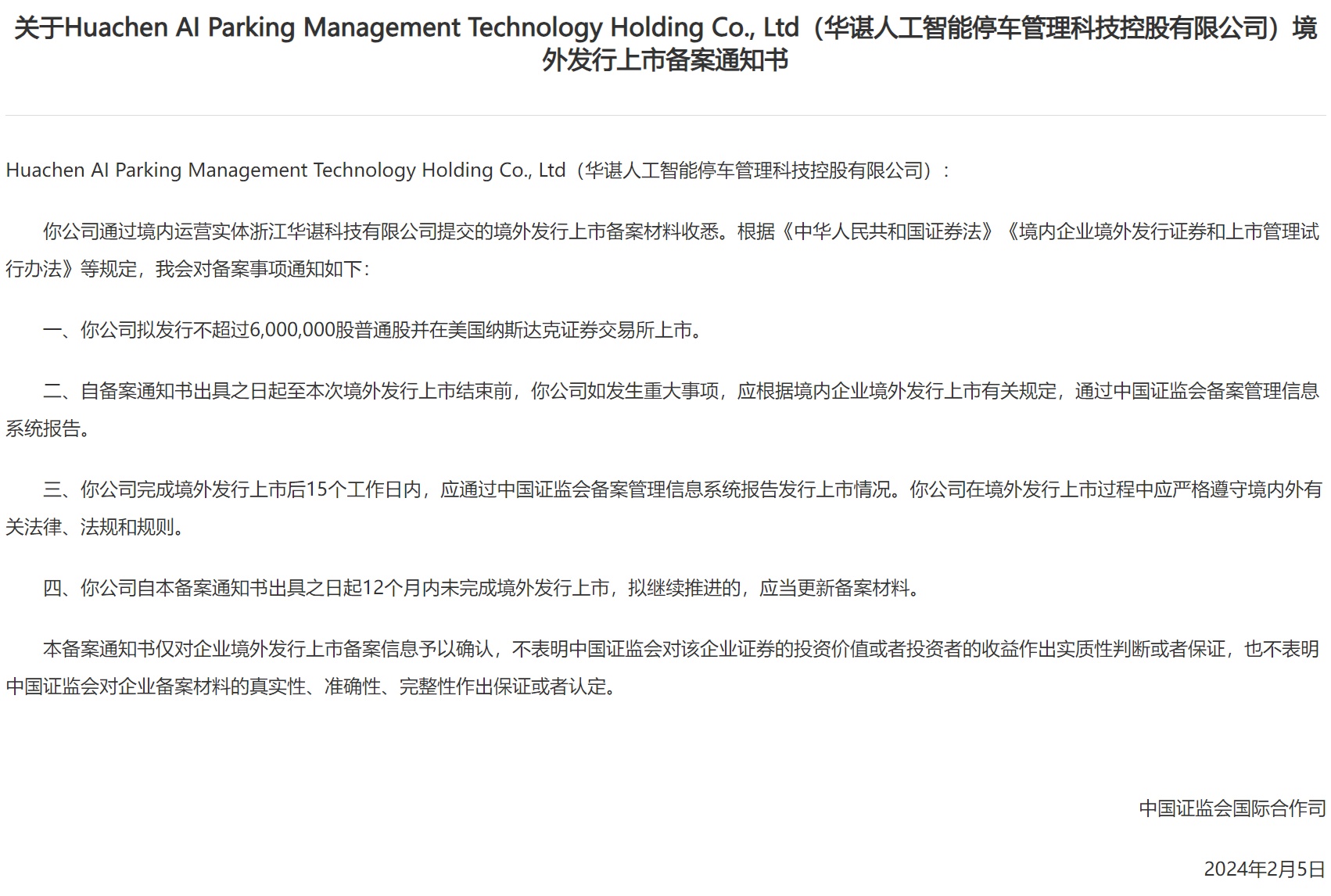 智通财经APP获悉,2月6日,中国证监会国际合作部发布关于Huachen AI Parking Management Technology Holding Co., Ltd(华谌人工智能停车管理科技控股有限公司)境外发行上市备案通知书,该公司拟发行不超过600万股普通股并在美国纳斯达克证券交易所上市。