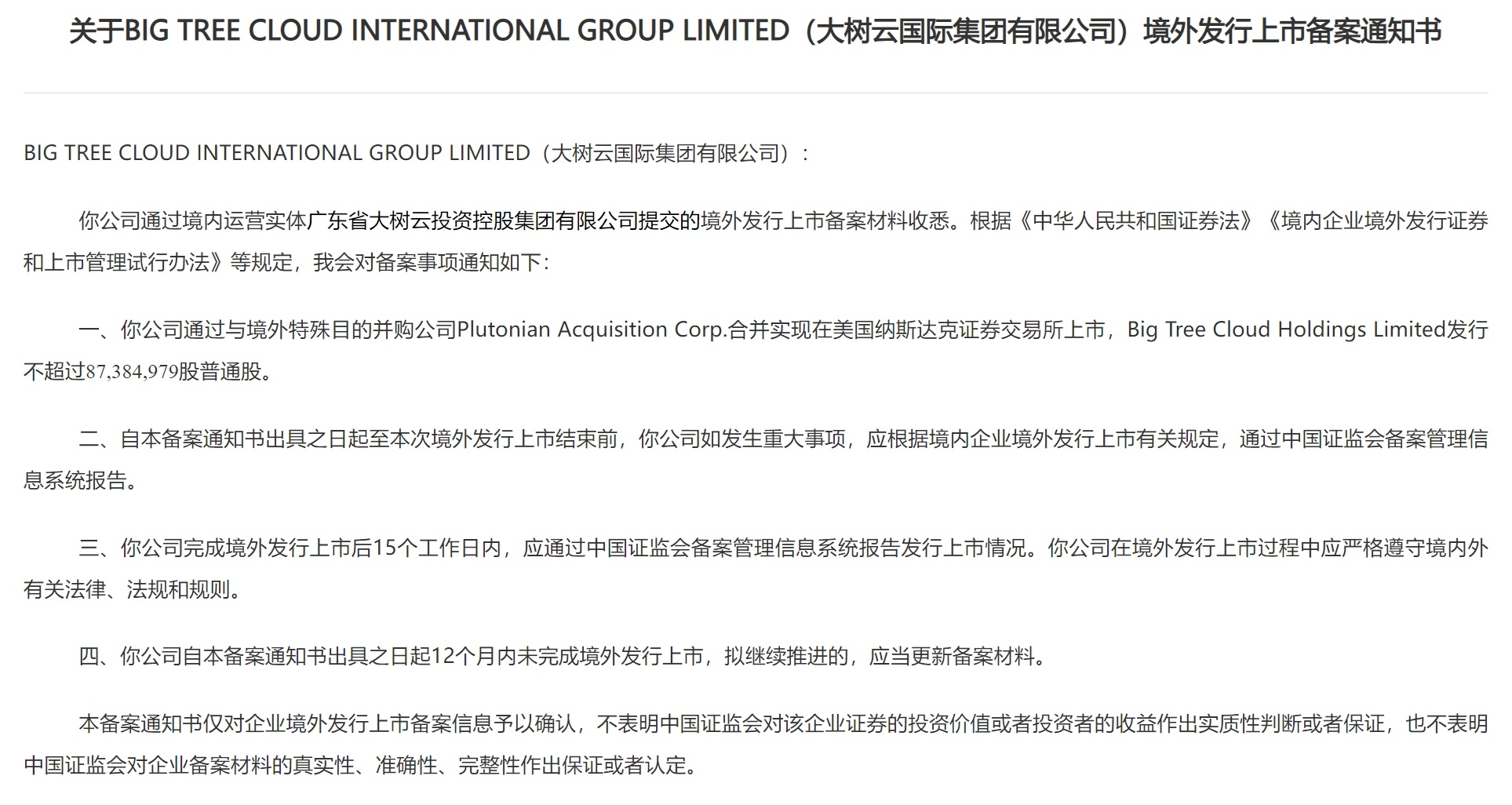 智通财经APP获悉,2月6日,中国证监会国际合作部发布关于BIG TREE CLOUD INTERNATIONAL GROUP LIMITED(大树云国际集团有限公司)境外发行上市备案通知书,该公司拟发行不超过8738.4979万股普通股并在美国纳斯达克证券交易所上市。