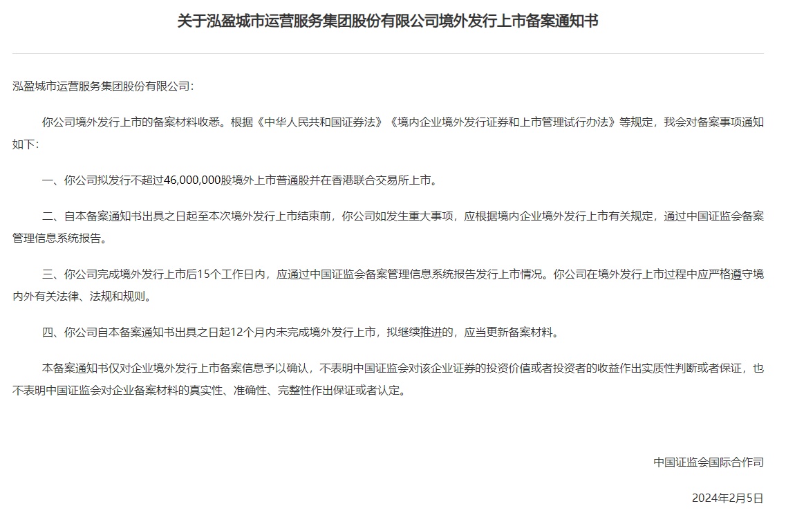 智通财经APP获悉,2月6日,中国证监会发布关于泓盈城市运营服务集团股份有限公司境外发行上市备案通知书。泓盈服务拟发行不超过4600万股境外上市普通股并在香港联合交易所上市。