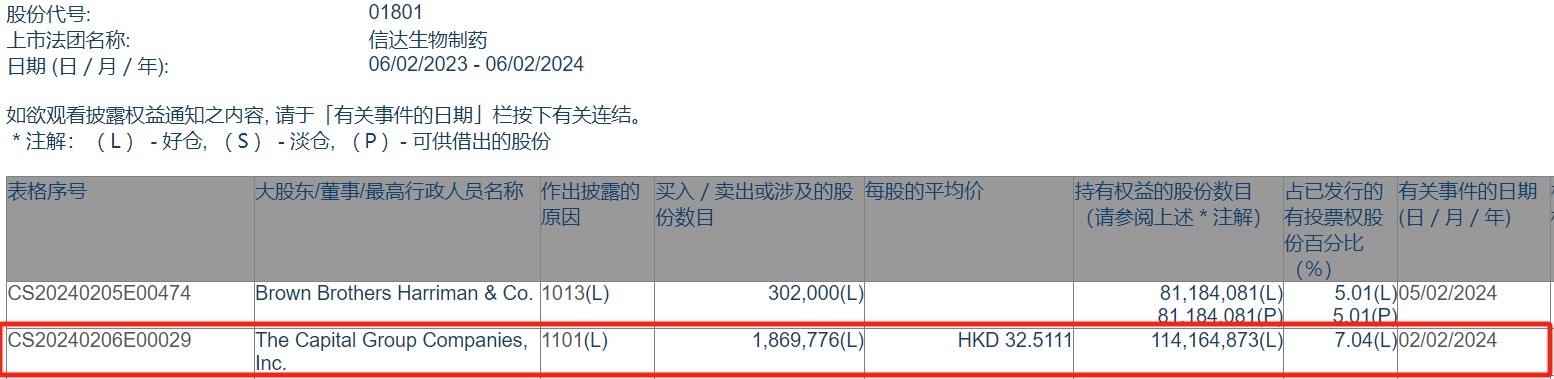 智通财经APP获悉,香港联交所最新资料显示,2月2日,美国资本集团增持信达生物(01801)186.9776万股,每股作价32.5111港元,总金额约为6078.85万港元。增持后最新持股数目约为1.14亿股,最新持股比例为7.04%。