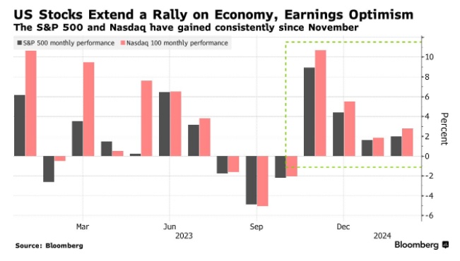 今年以来,美股持续反弹,标普500指数自2022年以来首次创下历史新高,原因是市场对强于预期的经济持乐观态度。科技巨头第四季度超预期的业绩也提振了市场情绪。