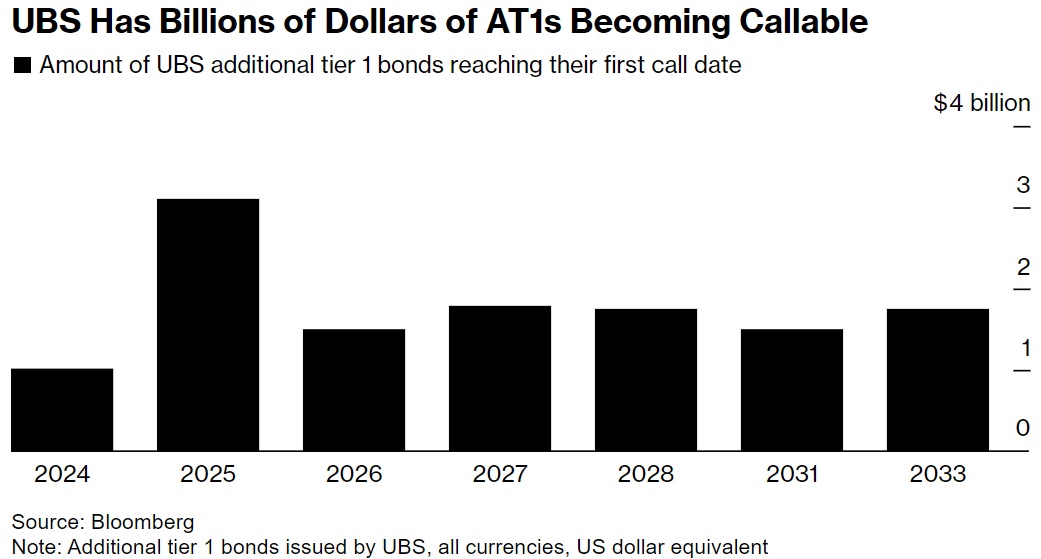 根据瑞士银行第四季度的投资者介绍,该银行的2024年融资计划设想发行高达20亿美元的AT1债券。声明称,从长期来看,瑞银计划提高资本比率,同时保持权益层稳定,"反映出AT1的逐步建立"。