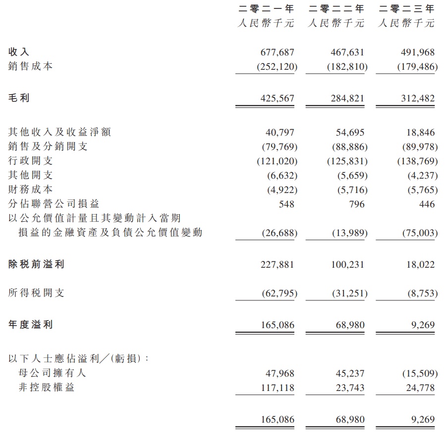 财务方面,公司于2021年、2022年及2023年年度,收入分别约为人民币6.78亿元、人民币4.68亿元及人民币4.92亿元。同期实现年度溢利分别约为人民币1.65亿元、人民币6898万元及人民币926.9万元。