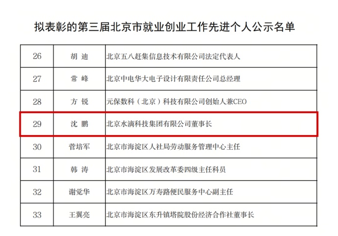 近日,北京市人力资源和社会保障局发布第三届“北京市就业创业工作先进集体和先进个人”评选结果,凭借在促进就业创业方面作出的贡献,水滴公司创始人兼CEO沈鹏获得“北京市就业创业工作先进个人”荣誉称号。