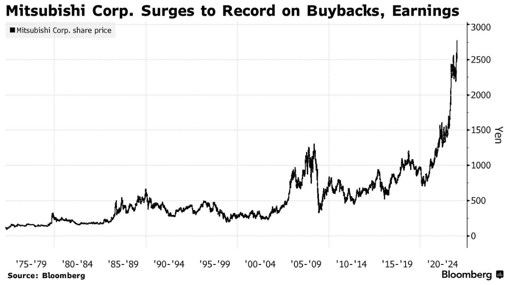 智通财经APP注意到,日本五大商社之一三菱商事的股价周三早盘一度大涨11%,创盘中历史新高。此前一天该公司宣布了一项被分析师称为“怪物”的股票回购计划,计划斥资至多5000亿日元回购至多10%的股份,并发布了好于预期的季度业绩,截至12月底的财季净利润飙升近两倍。