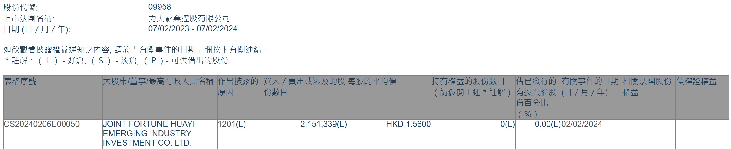 智通财经APP获悉,香港联交所最新资料显示,2月2日,JOINT FORTUNE HUAYI EMERGING INDUSTRY INVESTMENT CO. LTD.减持力天影业(09958)215.1339万股,每股作价1.56港元,总金额约为335.61万港元。减持后最新持股数目为0股。