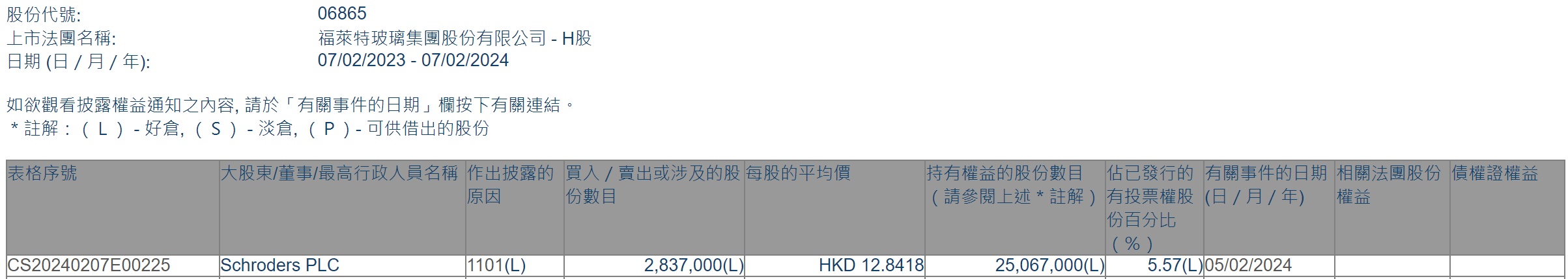 智通财经APP获悉,香港联交所最新资料显示,2月5日,Schroders PLC增持福莱特玻璃(06865)283.7万股,每股作价12.8418港元,总金额约为3643.22万港元。增持后最新持股数目为2506.7万股,最新持股比例为5.57%。