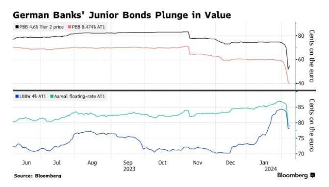 除了PBB之外,德国巴登-符腾堡州银行(LBBW)发行的7.5亿欧元AT1债券和Aareal Bank AG发行的3亿欧元债券周二也出现暴跌,周三延续下跌趋势。