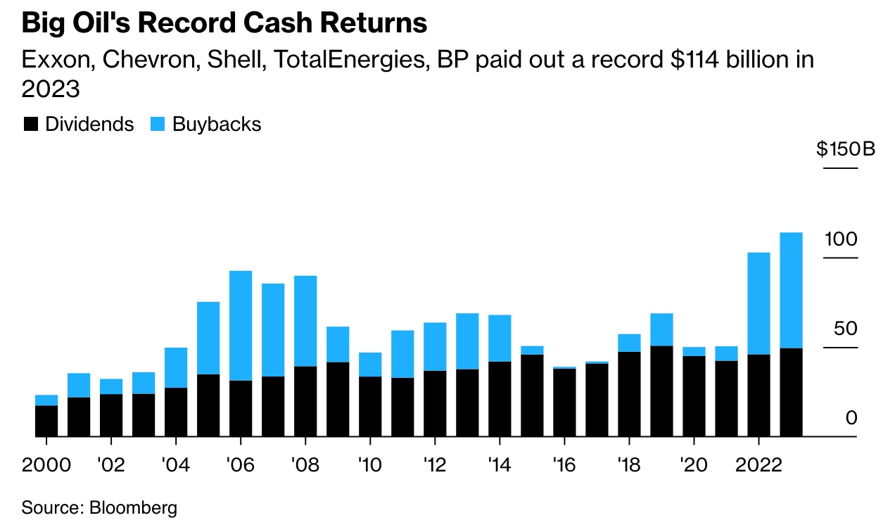 智通财经APP获悉,各大石油巨头在2023年向股东返还的现金比以往任何时候都多,因为这些公司的管理团队控制了新项目的支出,以腾出现金用于派发股息和回购股票。数据显示,埃克森美孚(XOM.US)、雪佛龙(CVX.US)、壳牌(SHEL.US)、道达尔(TTE.US)和英国石油(BP.US)在2023年原油价格大跌的情况下,花费了创纪录的1138亿美元用于股息和股票回购,较上一年高出10%以上。值得一提的是,2022年俄乌冲突导致全球能源市场陷入混乱,石油行业的利润大幅增加。