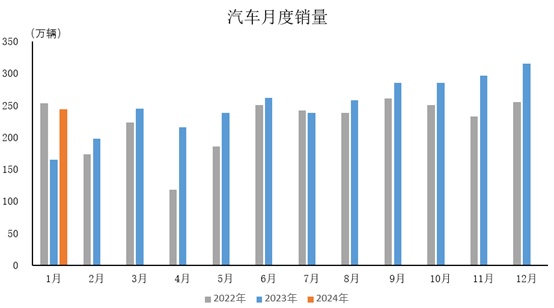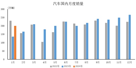 2024年1月,汽车国内销量199.6万辆,环比下降24.9%,同比增长48.1%。