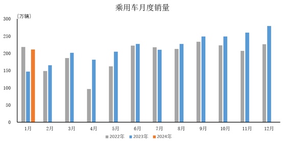 2024年1月,乘用车产销分别完成208.3万辆和211.5万辆,环比分别下降23.2%和24.2%,同比分别增长49.1%和44%。