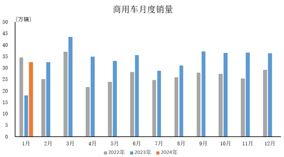 2024年1月,商用车产销分别完成32.7万辆和32.4万辆,环比分别下降10.7%和11.1%,同比分别增长66.2%和79.6%。