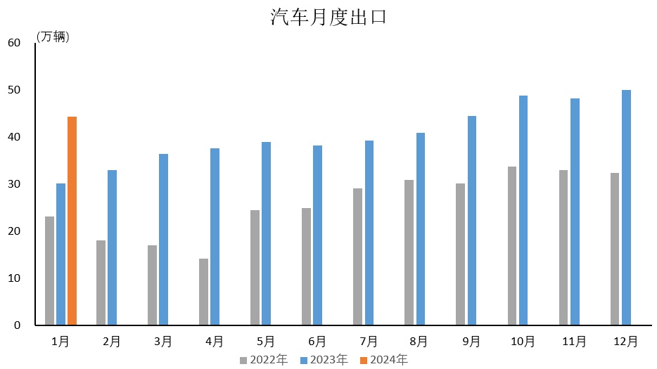 2024年1月,汽车出口44.3万辆,环比下降11.2%,同比增长47.4%。