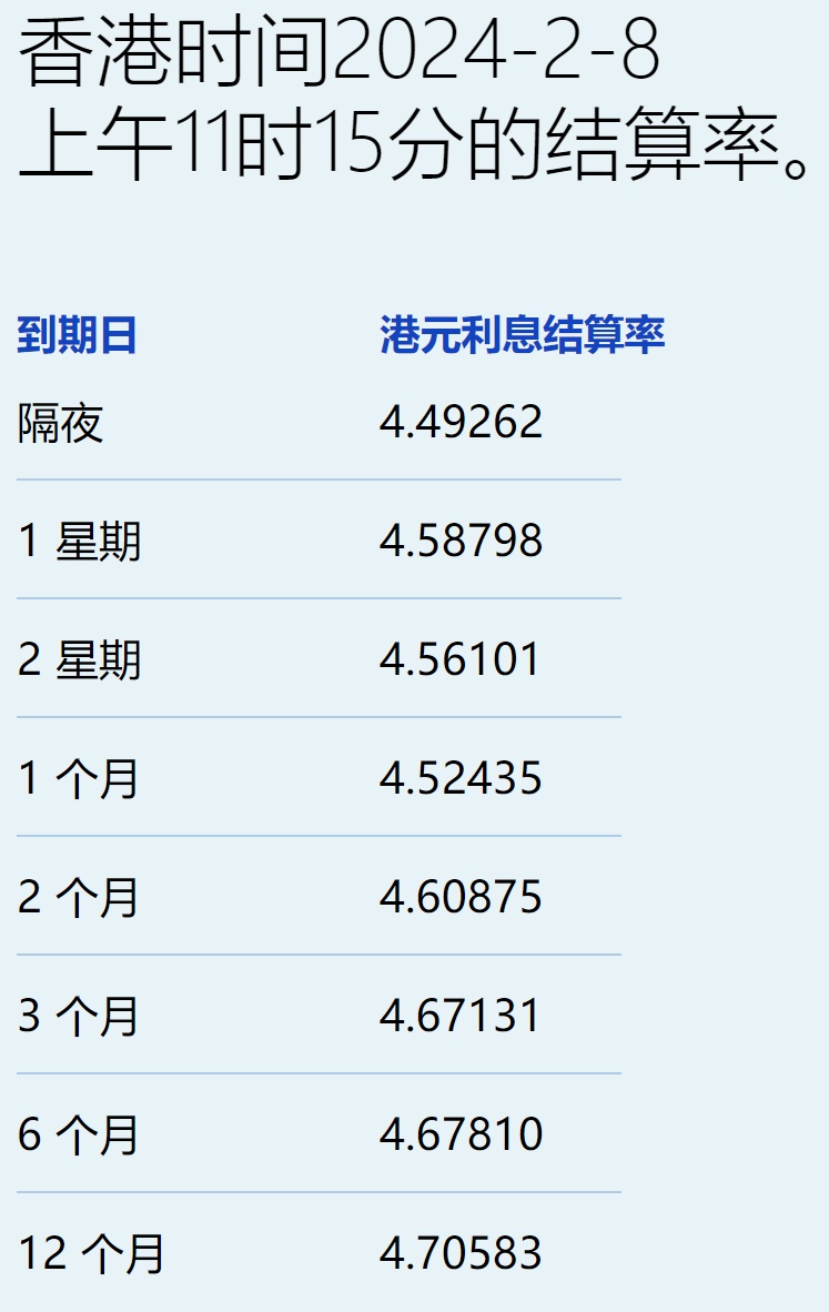 智通财经APP获悉,2月8日,港元拆息个别发展,隔夜拆息升36.833基点至4.49262%,连升两日,而与楼按相关的一个月拆息报4.52435%,跌0.44基点。短期拆息持续上升,一周及两周拆息分别升21.411基点及11.768基点,报4.58798%及4.56101%。反映银行资金成本的三个月拆息报4.67131%,升0.048基点;六个月跌1.351基点,报4.6781%;一年期则升1.494基点,报4.70583%。