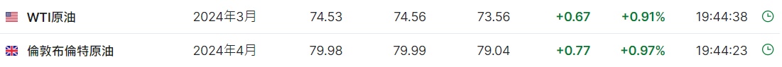 3. 截至发稿,WTI原油涨0.91%,报74.53美元/桶。布伦特原油涨0.97%,报79.98美元/桶。