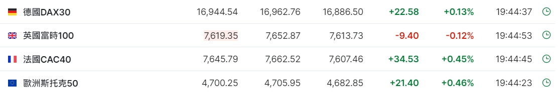 2. 截至发稿,德国DAX指数涨0.13%,英国富时100指数跌0.12%,法国CAC40指数涨0.45%,欧洲斯托克50指数涨0.46%。