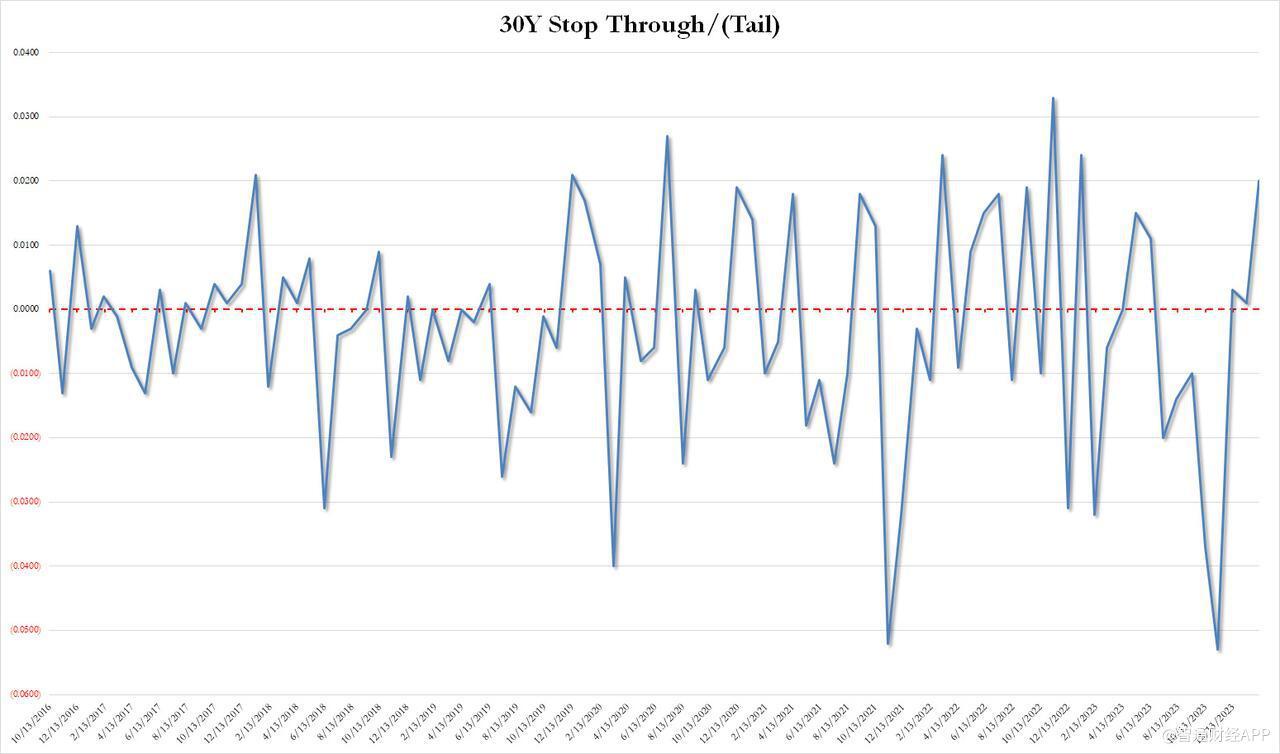 本次拍卖的30年期国债的最终成交利率为4.36%,较1月11日的上一次拍卖的4.229%有所上升。此次拍卖的预先发行利率为4.38%,最终成交利率比预发行利率低2个基点,显示出没有出现反映需求疲软的“尾部”现象。这一利率差异是自2023年1月以来最大的,凸显了市场对于此次拍卖的强烈需求。