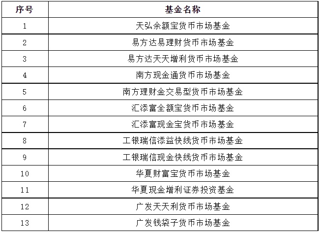 2023年2月,为强化重要货币市场基金监管,中国证监会联合中国人民银行共同发布《重要货币市场基金监管暂行规定》(以下简称《暂行规定》),《暂行规定》于2023年5月16日起正式施行。根据《暂行规定》相关要求,中国证监会于近期开展了评估工作,现确定13只货币市场基金产品为重要货币市场基金。目前,相关基金管理人和产品均已按照《暂行规定》要求,做好相应调整和准备工作。
