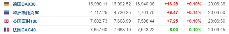 2. 截至发稿,德国DAX指数涨0.10%,英国富时100指数涨0.10%,法国CAC40指数跌0.10%,欧洲斯托克50指数涨0.14%。