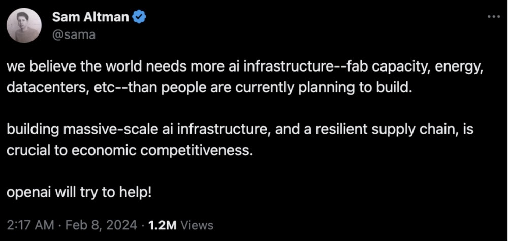 奥尔特曼本周三在X平台的推文中直言:“我们认为,世界对AI基础设施的需求,包括芯片制造能力、能源供给、数据中心等,已经远远超过了目前的建设计划。”