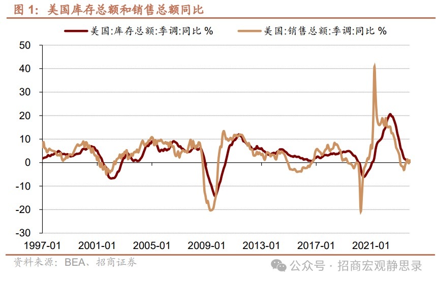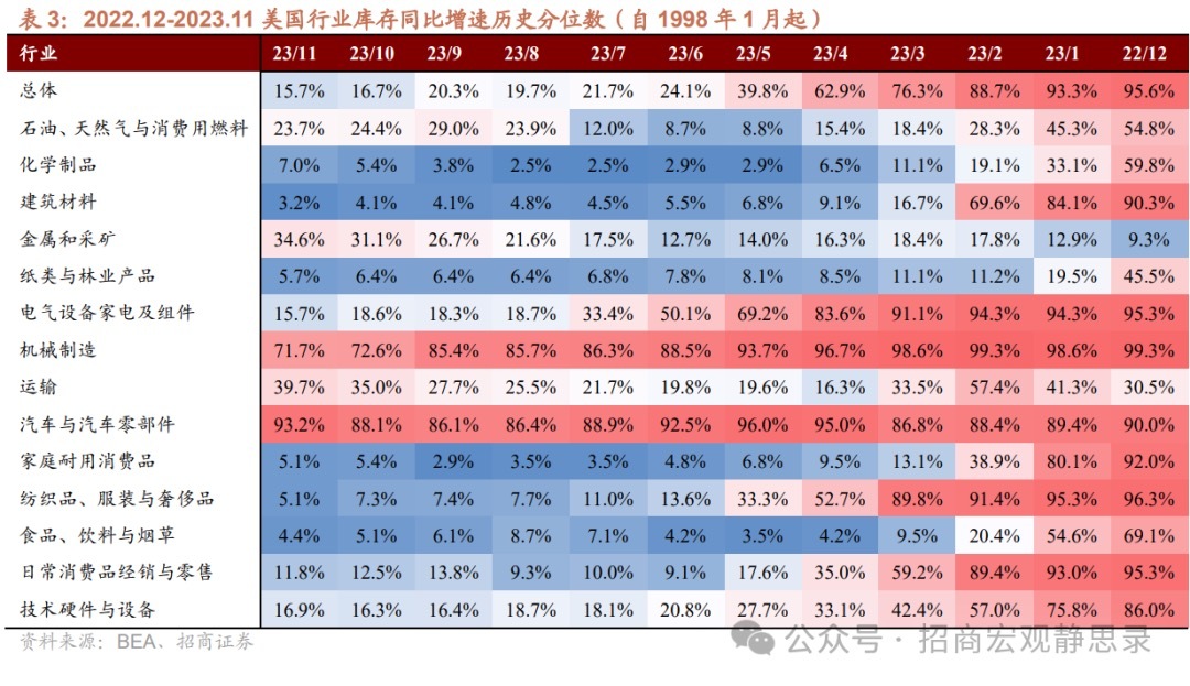 事件:2024年1月31日,BEA发布2023年11月美国分行业库存和销售数据。11月库存总额同比0.39%,前值0.65%;11月销售总额同比0.98%,前值-0.28%。14个行业中有6个行业进入主动补库,分别是石油、天然气与消费用燃料、金属和采矿、化学制品、家庭耐用消费品、日常消费品经销与零售、技术硬件与设备库存。