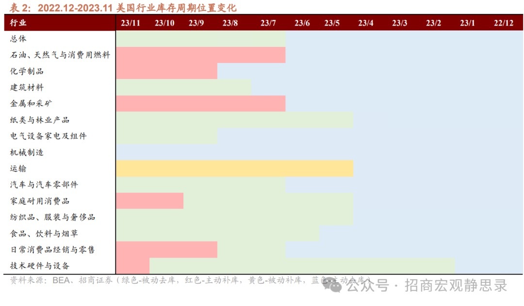 美国总体库存周期:正由被动去库向主动补库过渡。2023年7月美国PPI见底回升、进入被动去库,11月数据显示美国仍处被动去库。历史来看,被动去库持续时间一般为2个季度(不超过10个月),因此最迟或能在今年一季度前看到美国切换至主动补库,具体时点等待数据验证。11月14个大类行业中6个行业进入主动补库。当然,这些行业补库的持续性仍需观察,但此前几个月主要是上游的2个行业在主动补库,或表明美国正由被动去库向主动补库过渡。