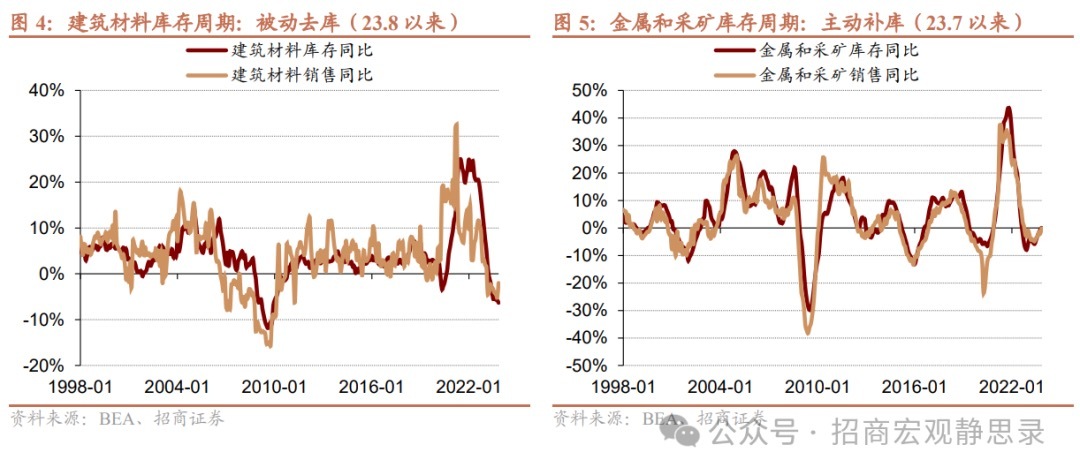 1997年以来美国已经历8轮库存周期,目前处于第9轮库存周期尾声。2023年7月美国PPI见底回升、进入被动去库,最新数据显示美国仍处被动去库,11月库存总额同比0.39%,前值0.65%,去库存趋势延续;11月销售总额同比0.98%,短暂波动后再度上行,前值-0.28%。历史来看,被动去库持续时间一般为2个季度(不超过10个月),因此最迟或能在今年一季度前看到美国切换至主动补库,具体时点等待数据验证。进一步地,BEA分行业库存数据显示,11月14个大类行业中有6个行业进入主动补库,分别是石油、天然气与消费用燃料、金属和采矿、化学制品、家庭耐用消费品、日常消费品经销与零售、技术硬件与设备库存。当然,这些行业补库的持续性仍需观察,但此前几个月主要是上游的2个行业在主动补库,这种迹象也表明美国正由被动去库向主动补库过渡。