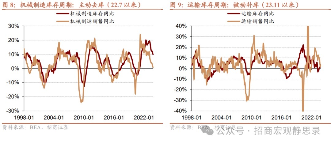 4)运输:23年5月由主动去库转向被动补库,尽管11月库存和销售同比均回升,但运输行业与多数行业的销售企稳带动库存回升并不一致,因此仍需观察再做判断。