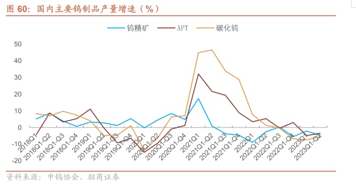 产量来看,从21年Q3至今,钨精矿产量开始持续下滑,这背后一定程度上和疫情影响矿山产出有关系,但考虑到矿山属于封闭环境,本身就与外界处于相对明显的隔离状态,疫情防控的难度较低,对矿山正常经营影响较小。由此,钨精矿产量负增长的主要原因或许是21年Q3之前,矿石价格上涨,矿山生产积极性提升,产量增长;但在21年Q3行业实际产能利用率已达到极限,之后因为老矿山产量下滑等原因,行业实际产能下滑,由此精矿产出下滑。