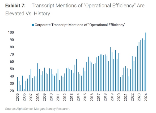 以Michael Wilson为首的一个团队在一份报告中写道,在本次财报季中,美国企业对“运营效率”的提及次数达到了有史以来的最高水平,因为企业专注于支出纪律,但也投资于“可以推动未来生产力的技术,如人工智能”。
