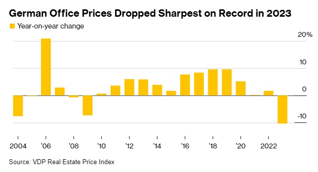 VDP董事总经理Jens Tolckmitt表示,房地产危机对写字楼的冲击比对住宅更大。他补充道,随着德国经济步履蹒跚,以及员工会否完全重返办公室的不确定性增加,“对写字楼的需求仍然低迷”。