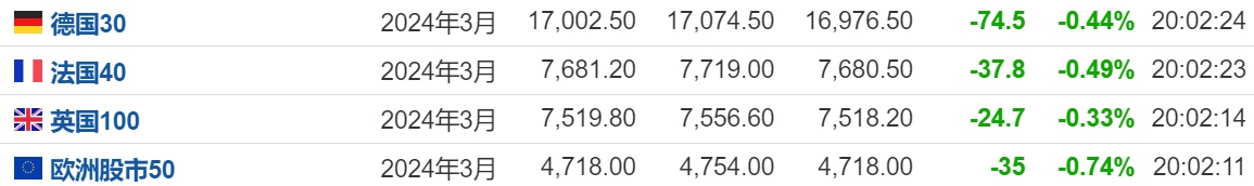 2.截至发稿,德国DAX指数跌0.44%,英国富时100指数跌0.49%,法国CAC40指数跌0.33%,欧洲斯托克50指数跌0.74%。