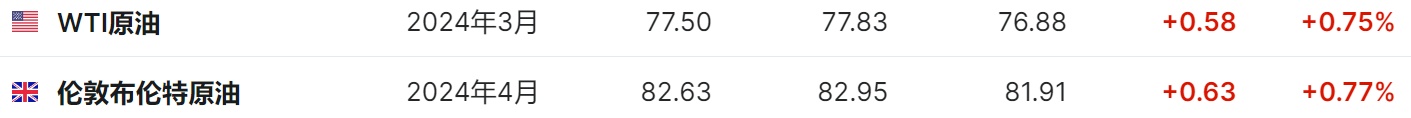 3.截至发稿,WTI原油涨0.75%,报77.50美元/桶。布伦特原油涨77%,报82.63美元/桶。