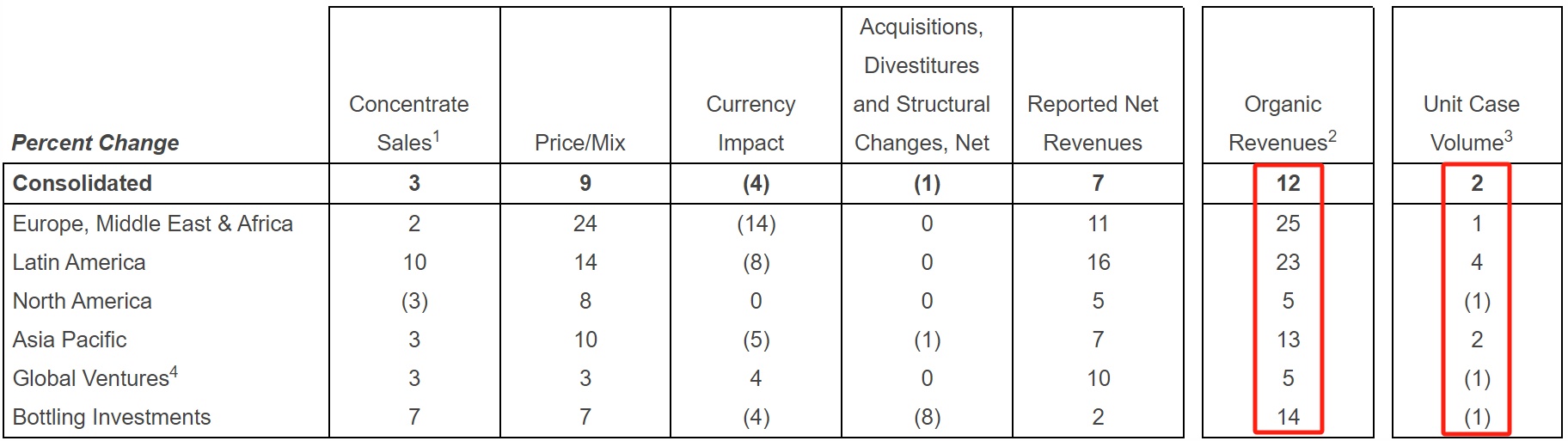 可口可乐四季度有机收入增长了12%,而普遍预期为+8.8%,其中拉丁美洲(+23%)、欧洲、中东和非洲(+25%)、亚太地区(+13%)和装瓶投资(+14%)的收入增长最快。