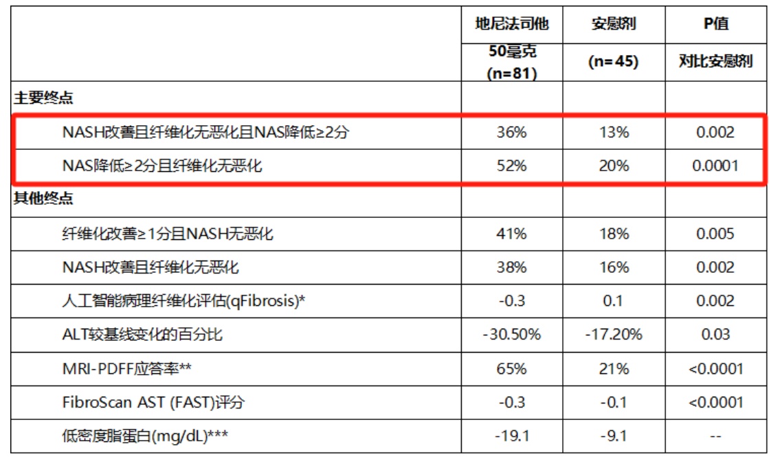 Resmetirom能获得FDA授予优先审评资格,正是基于亮眼的临床数据:采用金标准肝穿刺验证,给药52周,Resmetirom达到了NASH缓解和纤维化改善两个组织学主要终点。