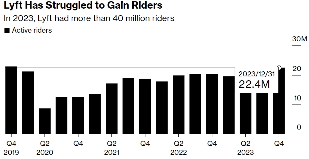 Lyft表示,2023年第四季度,其平台上的活跃乘客数量较上年同期增长10%,至2240万。2023年,Lyft拥有超过4000万名乘客,是其历史上最高的年度乘客数量。