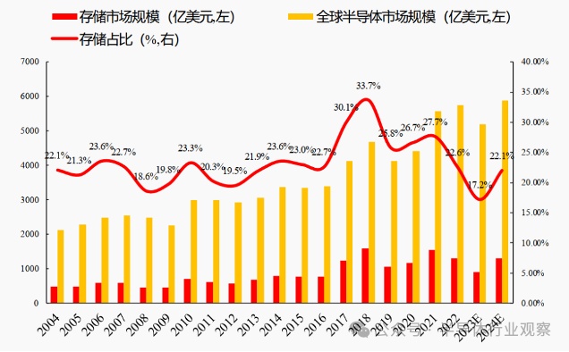 全球半导体和存储市场规模及占比(亿美元,%)