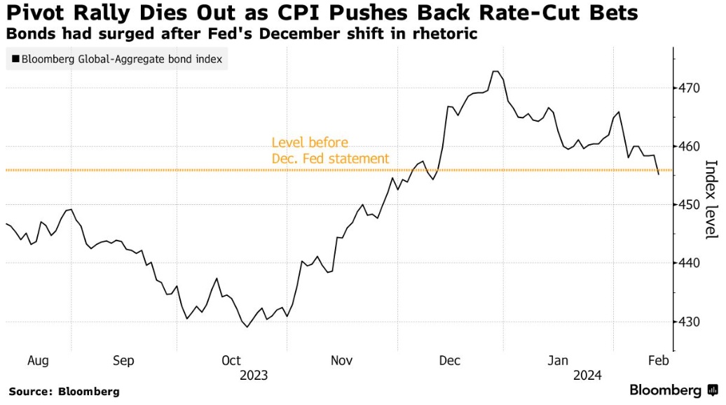 由于美联储主席杰鲍威尔带领主要同行强烈反对市场押注各国央行最早将于3月开始快速放松货币政策,全球债券今年大幅下挫。周二公布的数据显示,美国1月份通胀强于预期,促使交易员将对美联储首次降息的押注推迟至7月,这加速了市场跌势。