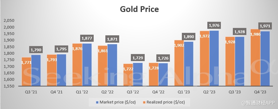 第四季度黄金市场价格为每盎司1971美元,环比增长2.2%,同比增长14.2%;黄金实际售价为每盎司1986美元,环比增长3%,同比增长14.9%。