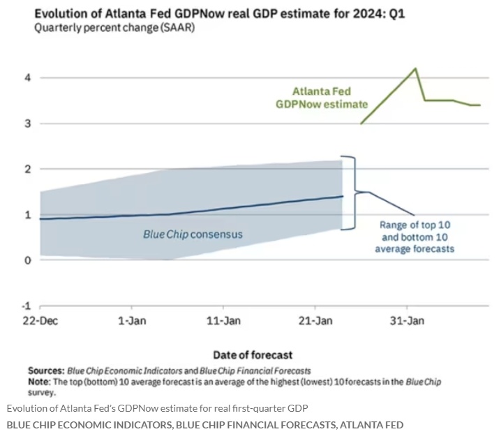 亚特兰大联邦储备银行的GDPNow模型估计,第一季度实际GDP增长率可能达到3.4%,这一数字将在周四再次更新。考虑到自2022年3月以来借贷成本上升了五个百分点以上,且较高的利率已有足够的时间来抑制经济增长,当前的3.4%估计相对较强。