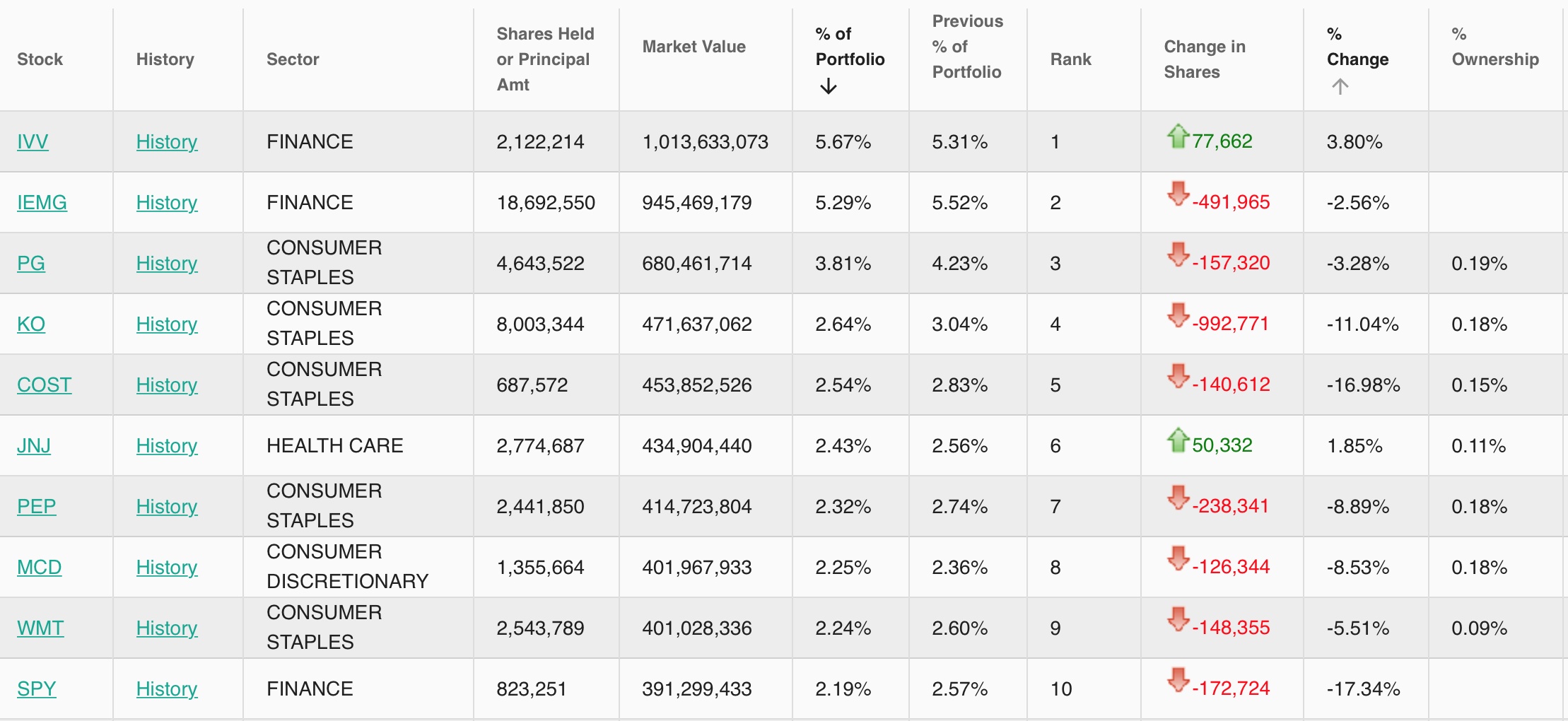 前五大卖出标的包括:百事可乐,宝洁,可口可乐,SPDR标普500指数ETF,沃尔玛。