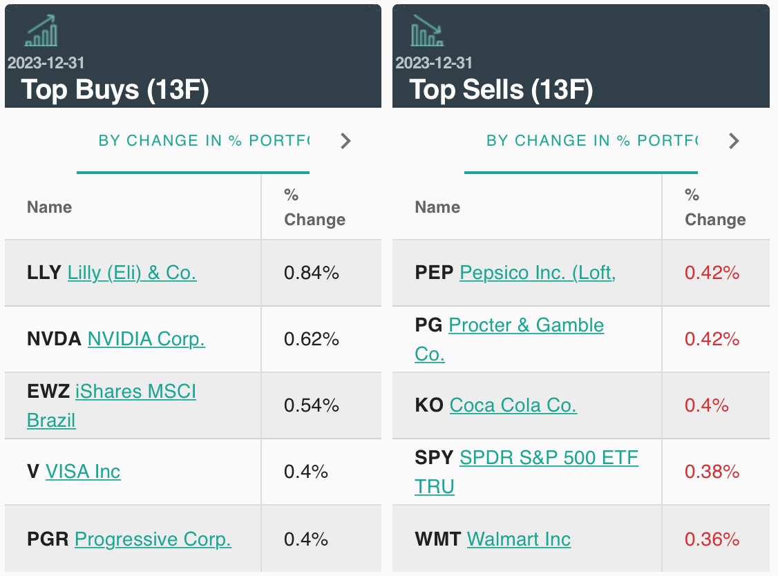 从持仓比例变化来看,前五大买入标的分别是:礼来(LLY.US),英伟达(NVDA.US),iShares巴西ETF(EWZ.US),Visa(V.US),前进保险(PGR.US)。