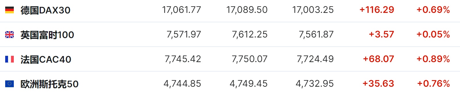 2.截至发稿,德国DAX指数涨0.69%,英国富时100指数涨0.05%,法国CAC40指数涨0.89%,欧洲斯托克50指数涨0.76%。