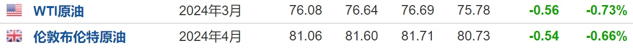 3.截至发稿,WTI原油跌0.73%,报76.08美元/桶。布伦特原油跌0.66%,报81.06美元/桶。