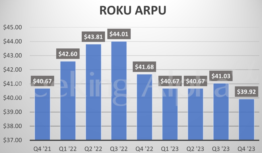 Roku在2023年的财务业绩反映了其将战略重点放在扩大用户基础和提高货币化上,业绩强调了Roku在竞争激烈的媒体多元化行业中推动收入增长的能力。尽管取得了这些成就,但Roku仍面临着挑战,其中包括每用户平均收入同比下降。此外,该公司在充满活力的宏观经济环境和不平衡的广告市场复苏中度过了难关,这可能对未来的增长构成风险。