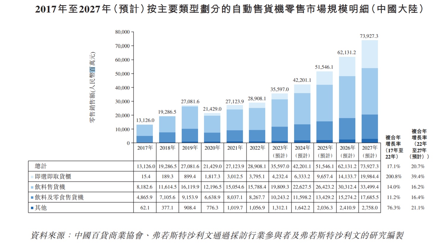 而从产业发展角度看,我国自动售货机零售市场仍处于快速成长期。据弗若斯特沙利文数据显示,从2017年至2022年,我国自动售货机零售市场的规模从131.26亿元增至2022年的289.08亿元,五年复合增速17.1%。未来,随着技术不断创新让自动售货机便利性的提升以及大众对自动售货机接受程度的不断提高,自动售货机零售市场发展有望进一步加速,规模增长至2027年的739.27亿元,五年复合增速20.7%。显然,弗若斯特沙利文预期疫情过后自动售货机零售市场将迎来加速发展。