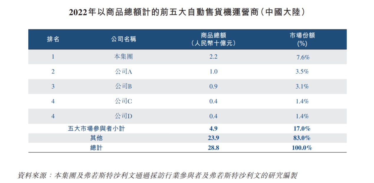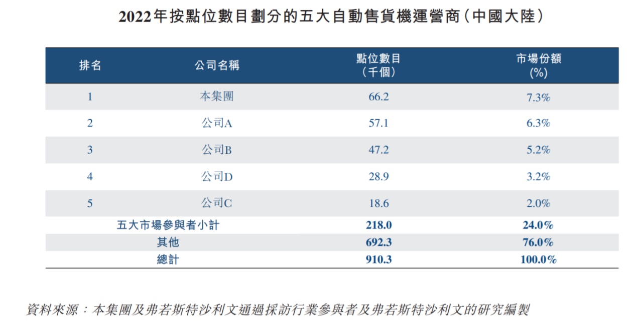 据弗若斯特沙利文数据显示,从点位数目来看,中国大陆市场中2022年前五大玩家共计拥有21.8万个点位,占比24%,其中友宝在线拥有点位6.62万个(不包括非友宝点位),占比7.3%,第二名、第三名分别拥有5.71万、4.72万个点位,占比分别为6.3%、5.2%。
