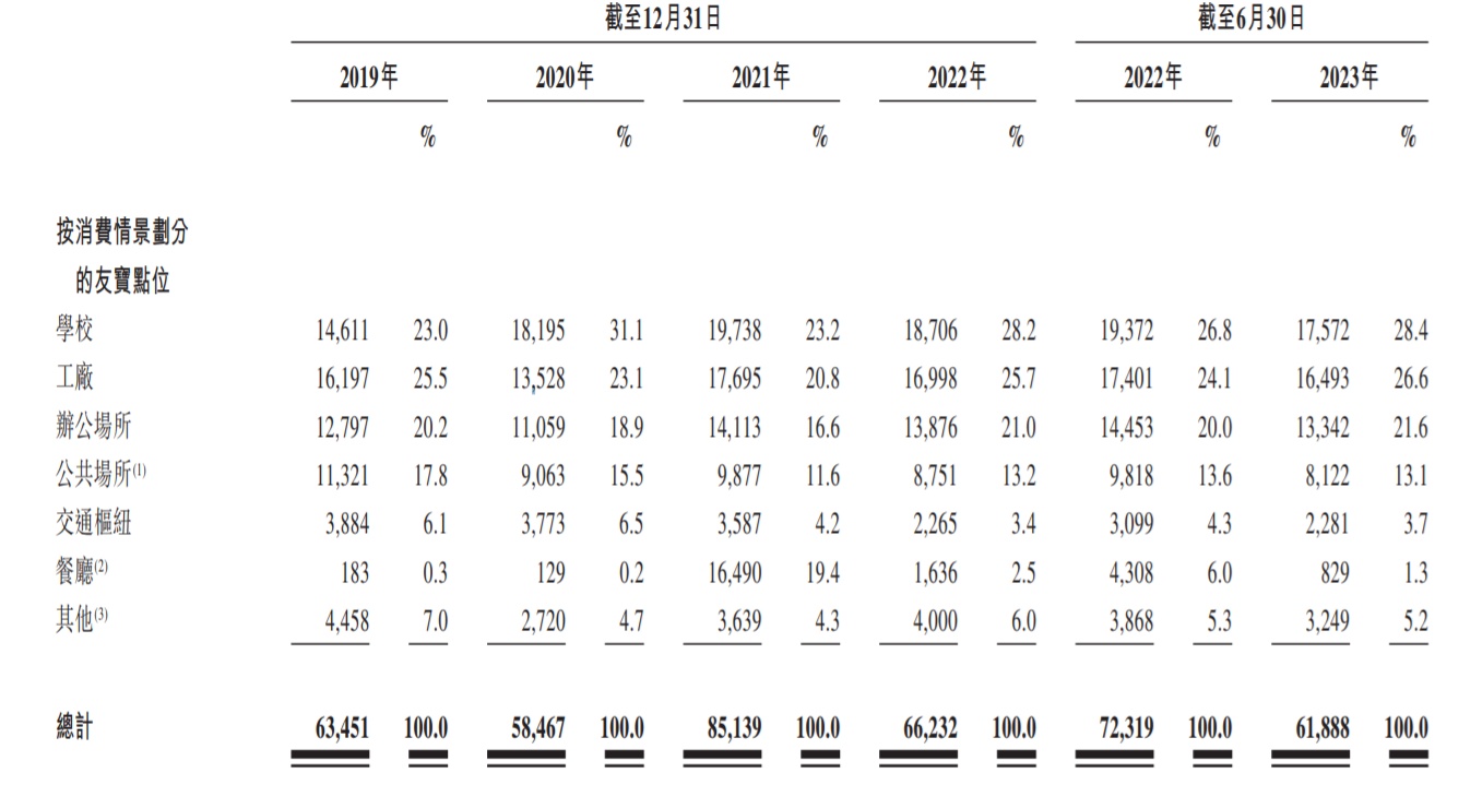 而这背后的原因或许有以下几个方面,其一是友宝在线的点位位置更加优质。据招股书显示,2023年上半年时,友宝在线的点位在一线城市、新一线城市、二线城市的占比分别为31.7%、34.5%、21.1%;从类型上来看,友宝在线的点位主要在学校、工厂、办公场所、公共场所等强需求场景内。