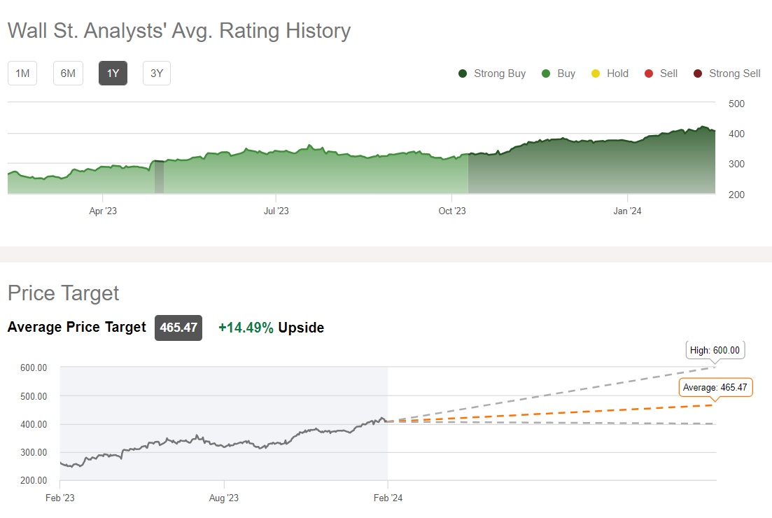 Seeking Alpha汇编的华尔街分析师共识评级以及目标价显示,华尔街分析师们对微软的共识评级为“强力买入”,平均目标价预期则高达465.47美元这一历史新高,意味着未来12个月的潜在涨幅高达14%。最高目标价则达600美元。