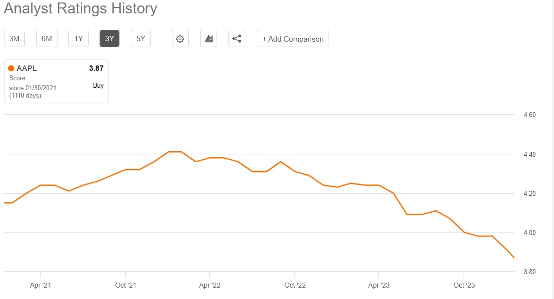 此外,Seeking Alpha统计数据显示,苹果的分析师评级分数近年来不断下滑,很大程度上反映出华尔街对这家科技巨头盈利前景的不安情绪。目前苹果Analyst Ratings仅仅为3.87分(满分为5分,相比之下英伟达与微软这一分数接近5),反映出越来越多的分析师将苹果评级由“买入”下调至“谨慎持有”或者“卖出”。